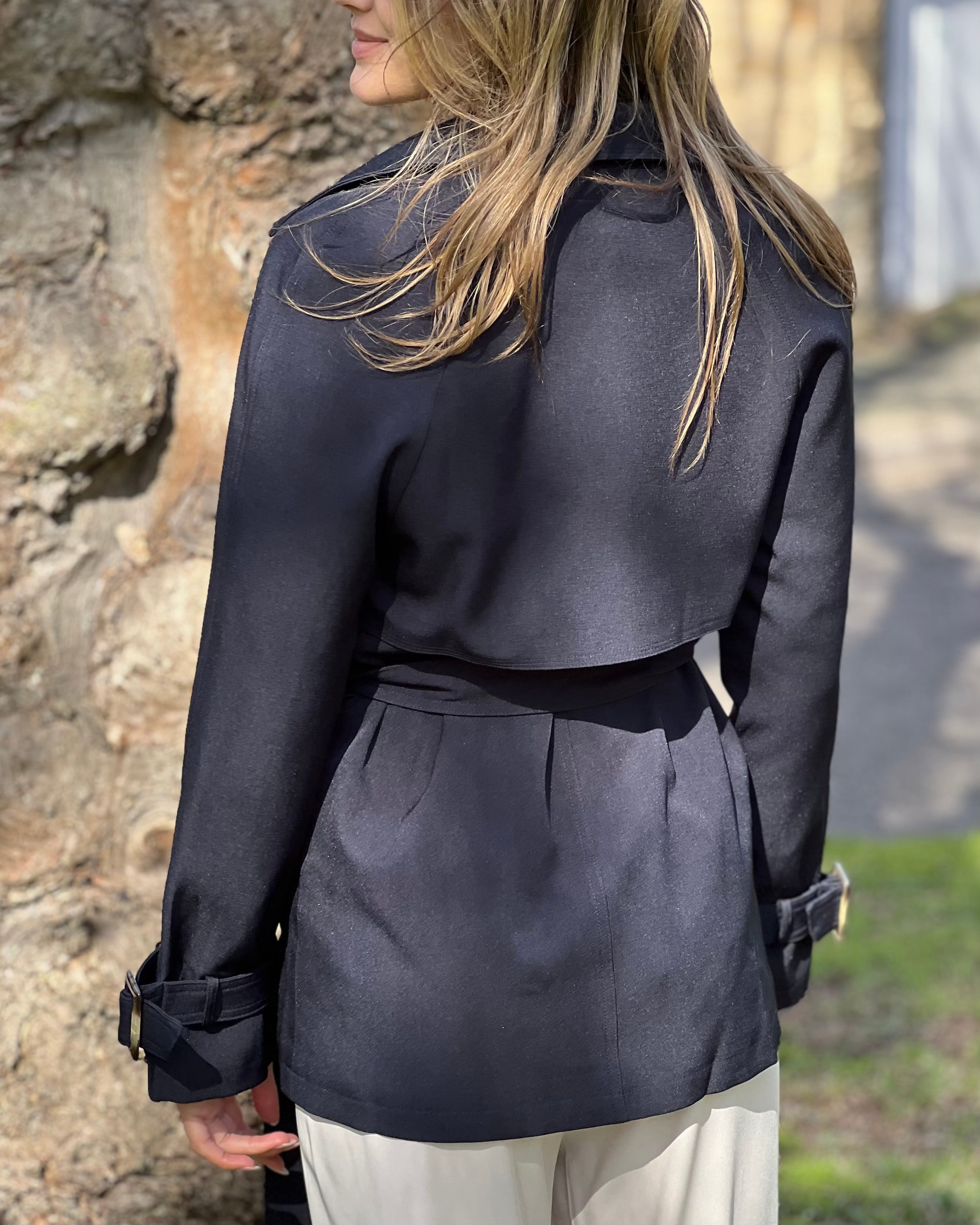 This classic short navy trench coat offers a sleek and modern take on the timeless style. Featuring a double-breasted front and a belted waist, it provides a flattering fit while maintaining a sophisticated look. The short length adds a contemporary twist, making it perfect for layering over both casual and dressy outfits. With its iconic collar and crisp lines, this trench coat is a versatile and stylish wardrobe staple for all seasons.
