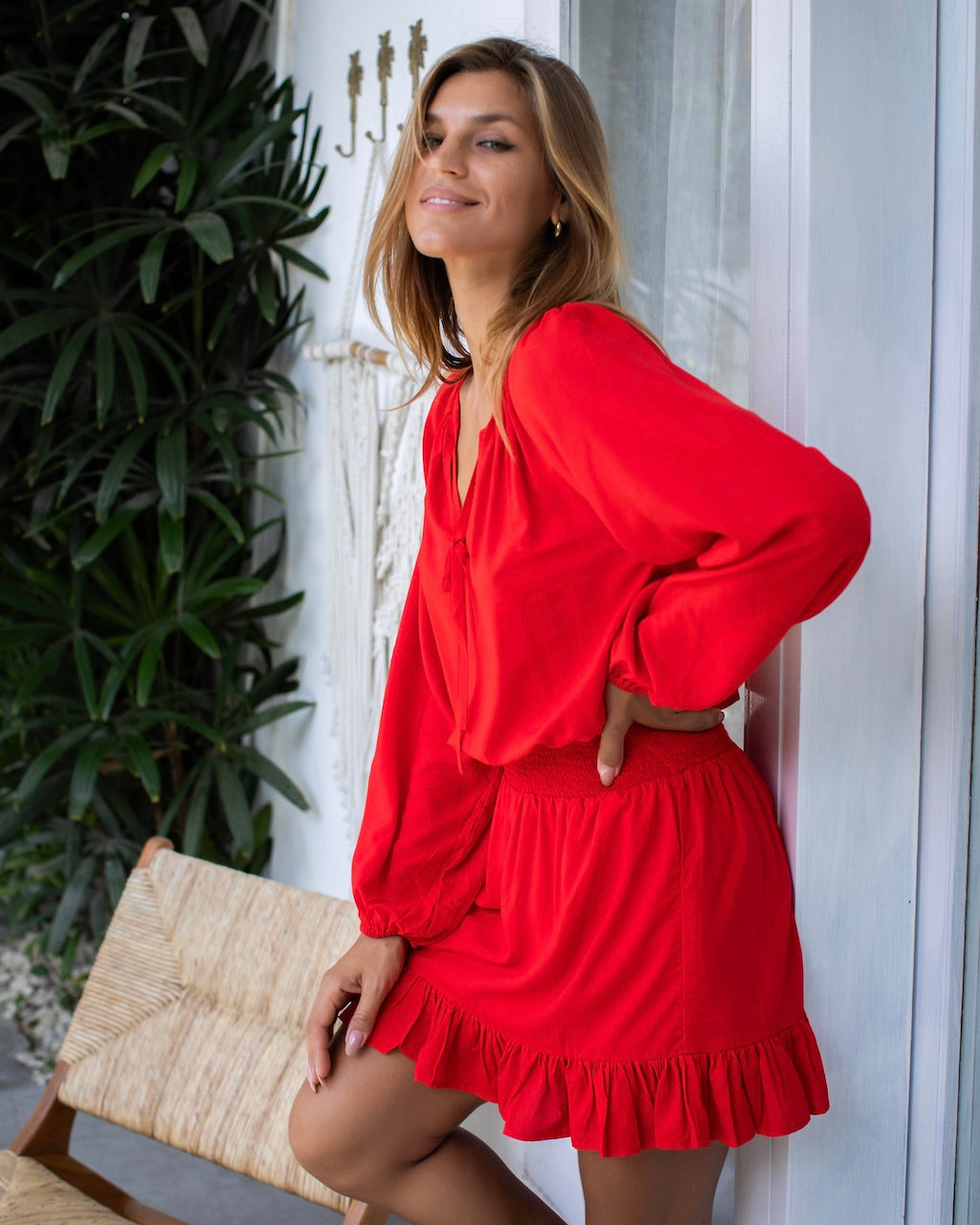 Effortlessly chic, the Neve Dress in vibrant Poppy Red is designed to take you from day to night with ease. Featuring a flattering shirred waist and voluminous elasticated sleeves, this knee-length dress offers comfort and style in equal measure. The elegant tie neckline and delicate frill hem add a touch of femininity, making it perfect for any occasion—whether you’re dressing it up or keeping it casual.