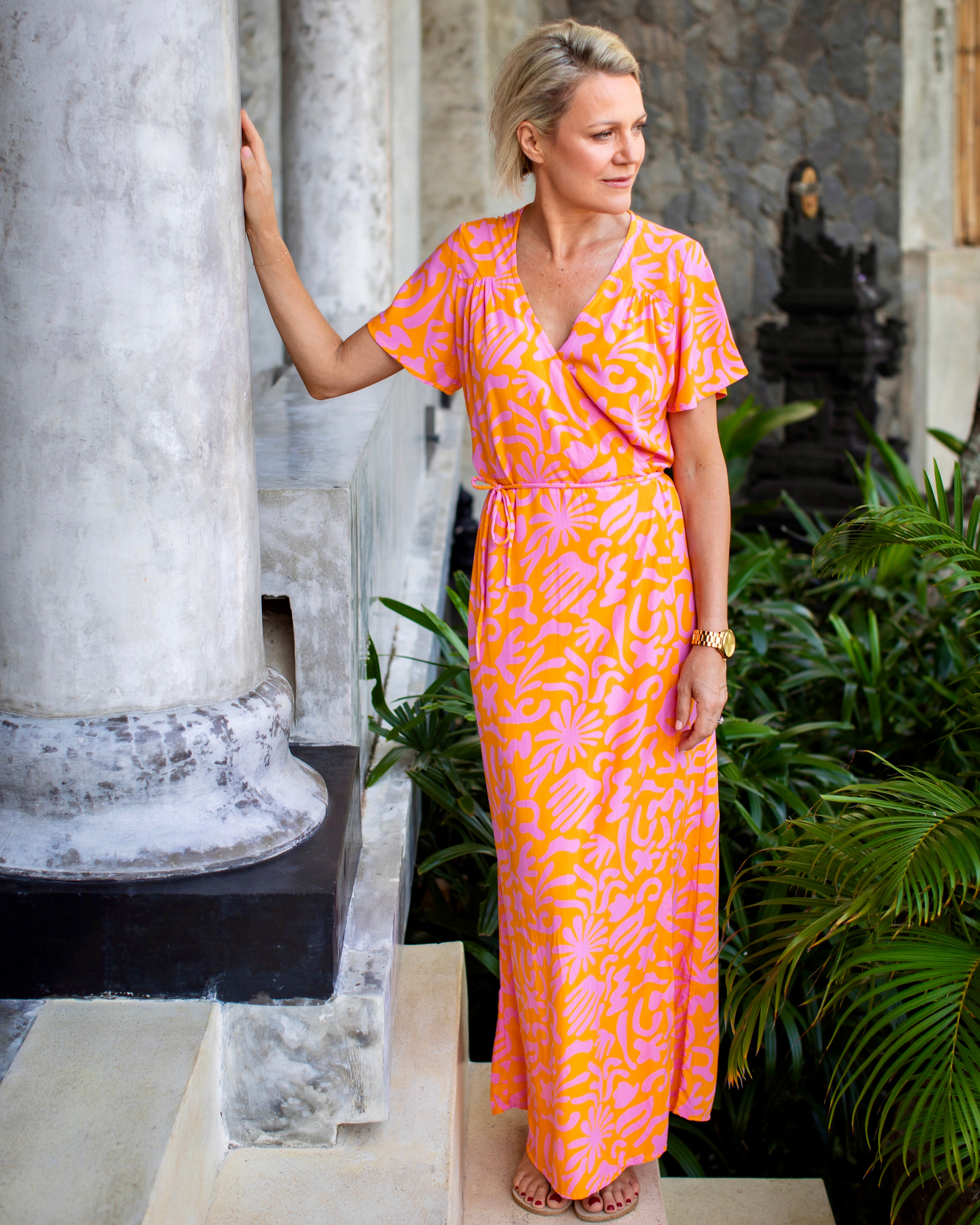 Step into the spotlight with the Sloane wrap dress in a bold pink orange abstract print. This long, flowing wrap dress combines a striking pattern with a flattering silhouette, offering a fresh take on a classic style. Perfect for making a statement at any occasion, it’s a must-have for those who love a vibrant, sophisticated look.