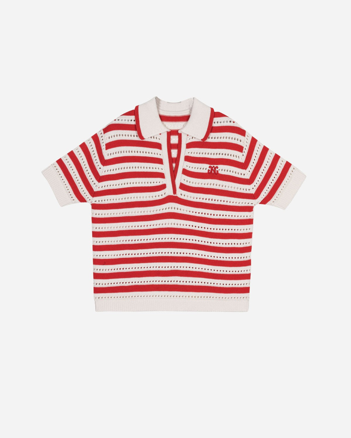The perfect staple red stripe T-Shirt for your all-year-round wardrobe. With a collared V neckline and a contrast trim detail around the cuff and the neckline.